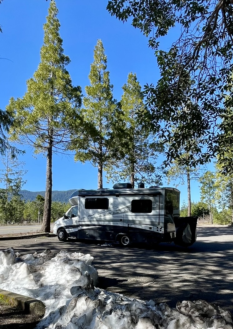 Traveling from Shady Cove to Bend (via Crater Lake) was one of the best and longest days we've experienced to date. We were curt-eously warned when we left Shady Cove that it might not be possible to get up to the rim of Crater Lake. Being Trish and Joel though, we thought we'd give it a shot anyway!